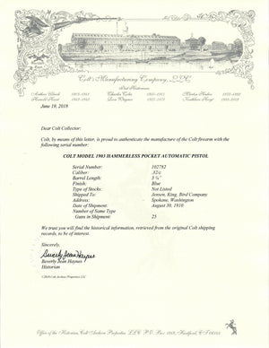 This Colt 1903 Pocket Hammerless was shipped to the Jensen, King and Bird Company of Spokane Washington on August 30th, 1910 in a 25 gun shipment. It's considered to be a type 2 pistol with a shorter 3 3/4" barrel but still has the separate barrel bushing. Thumb safety has the external retaining screw. This pistol is finished in Colt's high polish blue finish with fire blue small parts. The grips are type 1 hard rubber with the scallops along the name colt.