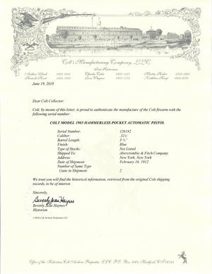 This Colt 1903 Pocket Hammerless was shipped to the Abercrombie & Fitch Company in New York, New York on February 16th, 1912 in a 2 gun shipment
