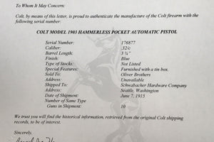 This Colt 1903 Pocket Hamerless was shipped to the Schwabacher Hardware Company in Seattle Washington on June 7th, 1915 in a 10 gun shipment.