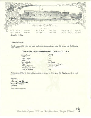 This Colt 1903 Pocket Hammerless was shipped to the Government of Belgium on January 11th, 1916 in a 500 gun shipment.