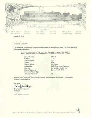While this particular pistol has the "A" inside of the diamond shaped box, the factory letter it was shipped to the Tufts-Lyons Arms Company in Los Angeles, CA on December 18th 1916. This would have been one of the few pistols that did not ship to Belgium and is one of the few factory overruns.
