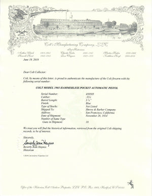 Colt 1903 Pocket Hammerless 32ACP Model M was shipped to the Shreve & Barber Company of San Francisco, California on November 28th 1924 in a 10 gun shipment.