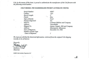 This Colt 1903 Pocket Hammerless is late type 1 variant. It features Colt's high polish blue finish with fire blue small parts. Has a 4" barrel with external barrel bushing. Thumb safety has an retaining screw on the right side of the frame. Note the slide has slide serrations that are now fully cut instead of plunge milled. At this point the roll mark has changed from the "Browning's Patent" to "Patented".