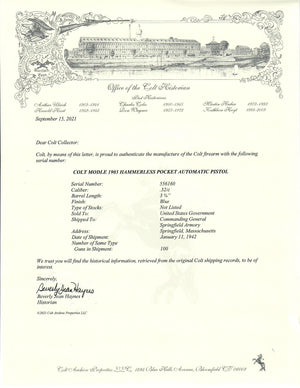 This Colt 1903 Hammerless was shipped on January 11th, 1942 in a 100 gun shipment to the Commanding General at Springfield Armory in Springfield, Massachusetts.