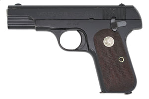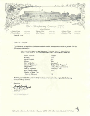 This Colt 1903 is an early WWII Military contract pistol which was originally blued but then at a later date painted black as discussed further in the description. The factory letter states this pistol was shipped to the U.S. Government February 4th, 1942 in a 100 gun shipment. The letter indicates that it was factory engraved with "U.S. Property" which would be underneath the punch struck X's. The trigger guard is W.B. inspected.