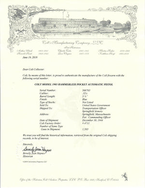 This Colt 1903 Pocket Hammerless was shipped to the Transportation Officer at Springfield Armory in Springfield, Massachusetts for the Commanding Officer on December 30th, 1944. It was on Colt Factory Order #4711 in a 1,583 gun shipment.