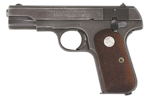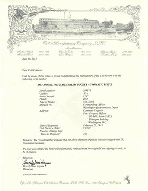 This Colt 1903 Pocket Hammerless was shipped to the Commanding Officer, Washington Quarter Master Depot in Cameron Virginia on February 20th, 1945 in a 504 gun shipment. The factory letter states this was for the Property Officer G2/MIS, Room 2-B731 at the Pentagon in Washington, D.C. The factory letter states that this particular pistol was also shipped with 252 Commando revolvers.