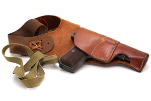 This Colt 1903 Pocket Hammerless is a well worn piece and shows most of it's wear through the center of the slide. Most likely from being carried in the spring clamp shoulder holster. This civilian holster which has been modified with a piece of military web strapping has been scavenged from something else. An interesting combat carry rig.