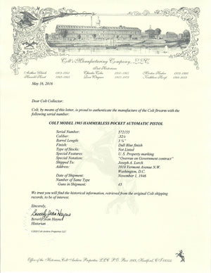 This is an interesting Colt 1903 Pocket Hammerless. It was shipped November 1st, 1946 in a 43 gun shipment. The factory letter states it was shipped to Joseph A. Lorch at 1010 Vermont Avenue N.W. in Washington, D.C. Special features include a "U.S. Property marking" and the finish is listed as a Dull Blue finish.