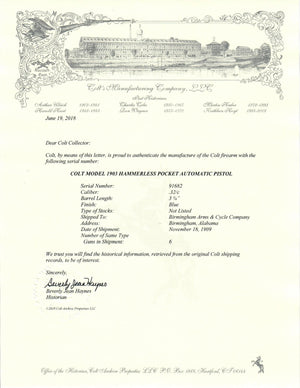 This Colt 1903 Pocket Hammerless was shipped to the Birmingham Arms & Cycle Company in Birmingham Alabama on November 18th, 1909 in a 6 gun shipment. It was sent back to the factory to be refinished roughly somewhere around 1914 due to the 1914 address which has all periods in the dates rather than than the commas as before.
