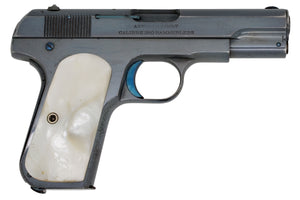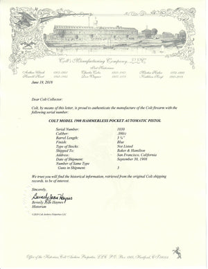 This Colt 1908 Model M is considered to be a type 2 pistol. It was shipped to Baker & Hamilton in San Francisco, CA on September 30th 1908 in a 3 gun shipment. There were no type 1 configurations in the 380ACP/1908 model. The pistol is wears Colt's High Polish finish with fire blue small parts.