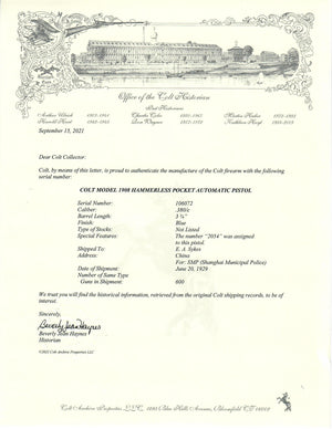 This Colt 1908 Pocket Hammerless shipped to E.A. Sykes in China For: SMP (Shanghai Municipal Police) on June 20th, 1929 in a 600 gun shipment. Special features state that "2054" was assigned to this pistol.