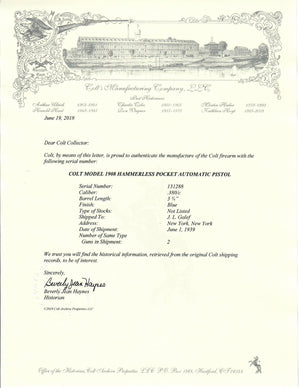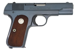This is a near new example of a Type 4 Colt Model 1908. It was shipped to J.L. Galef in New York, New York on June 1st, 1939 in a 2 gun shipment. Exhibits Colt's Fine Brushed Blue finish with walnut grips. Colt medallions are flush, left panel is forward facing while right panel is rear facing.