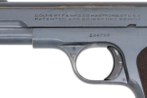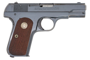 This Colt 1908 is considered a type IV. It has the rounded front and rear sights, 17 slide serrations, 3 3/4" barrel with integrated barrel bushing and checkered walnut grips.