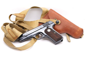 The holster is a brown leather snap holster with tan leather webbing. It's believed that this is a Naval Pilot Holster.