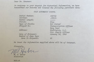 This Colt 1908 Pocket Hammerless was shipped to the Transportation Officer, Navy Yard in Washington, D.C. for the Supply Officer on January 25th, 1943. Total number of guns in this shipment was 43.