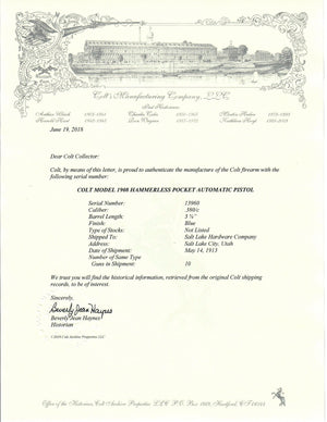 Colt 1903 Serial Number 13960 is considered a type 3 variant of the model M.  It was shipped to the Salt Lake Hardware Company in Salt Lake City, UT on May 14th, 1913 in a 10 gun shipment.  It features Colt's high polish blue finish with fire blue small parts.  Note the type 2 rubber grips and the lack of the thumb safety retaining screw.
