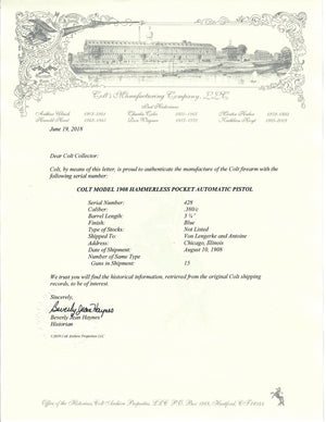 This Colt Pocket Hammerless is a first year example of the 1908.  It was shipped to Von Lengerke and Antoine of Chicago, Illinois on August 10th, 1908 in a 15 gun shipment.  It features Colt's high polish finish with fire blue small parts.  This is considered a Type 2 variation of Colt's model M pistols.
