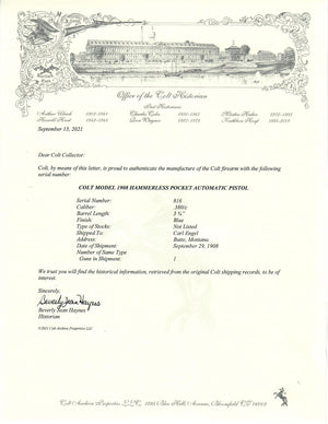 This Colt 1908 Pocket Hammerless is a first year example of the Colt 1908. It was shipped to Carl Engle in Butte, Montana on September 29th, 1908 in a single gun shipment.