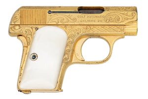 As you can see from the photos the pistol is wearing a gold finish and pearl grips. The gold plated finish appears identical to other documented gold plated finish pistols. Colt was known for building high grade examples for department stores or shooting matches to have on display to showcase Colt's capabilities. With this particular example going out and being returned twice we are unable to determine when the finish was applied.