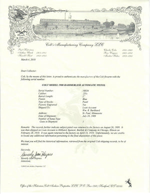 The remarks on the letter read: The records further indicate subject pistol was returned to the factory on August 26th, 1909. It was then shipped on Loan Account to Spencer Hibbard of the Bartlett & Company in Chicago, Illinois on February 28th, 1910. It was again returned to the factory on April 14th 1910. Unfortunately, we are unable to locate any additional information pertaining to the final disposition of this piece.