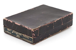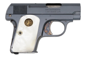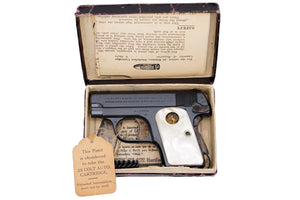 This vest pocket features Colt's fine brush blued finish with factory pearl round top grips with forward facing medallions. Along with this Vest Pocket is a maroon Colt box with dark blue label. Inside the box there is the original hang tag and the factory barrel cleaning brush.