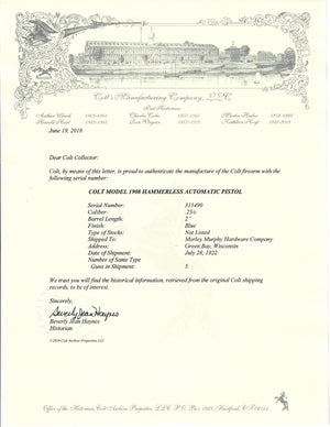 This Colt 1908 Vest Pocket was shipped to the Morley, Murphy Hardware Company in Green Bay, Wisconsin on July 28th, 1922 in a 5 gun shipment.