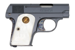 This vest pocket features Colt's fine brushed blue finish with pearl round top grips with forward facing flush medallions. The trigger, thumb safety and grip safety are case colored.