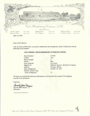 This Colt Vest Pocket was shipped to the Hibbard, Spencer, Bartlett & Company in Chicago, Illinois on October 19th, 1922 in a 75 gun shipment.