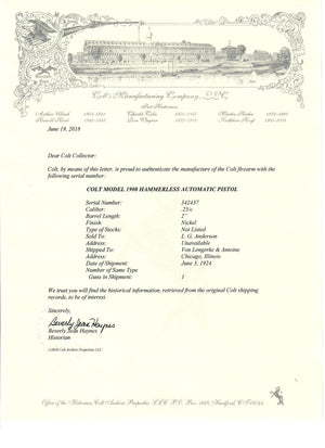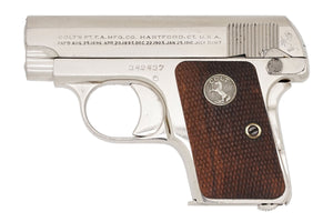 This Colt Vest Pocket pistol was built in 1924. It features Colt's Nickel finish and has Colt's factory checkered walnut grips. It was Sold to L.G. Anderson and shipped to Von Lengerke & Antoine in Chicago, Illinois on June 3rd, 1924.