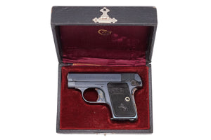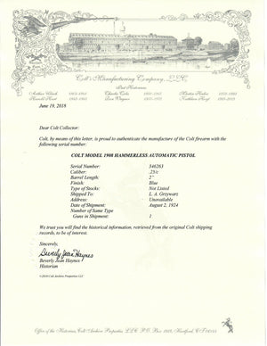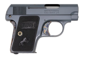 This Colt 1908 Vest Pocket was shipped to L.A. Grzywarz on August 2nd 1924 in a single gun shipment. It features Colt's fine brushed blue finish and hard rubber square top grips. The trigger, thumb and grip safety are case colored.