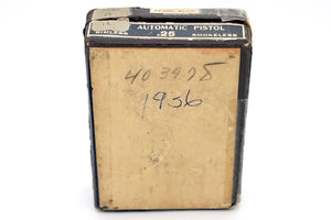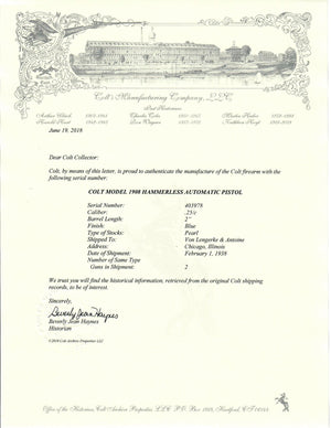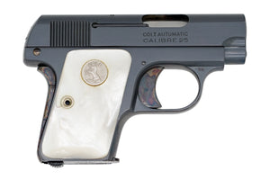 This Colt 1908 Vest Pocket was shipped to Von Lengerke & Antoine of Chicago, Illinois on February 1st, 1938 in a 2 gun shipment. It features Colt's Fine Brushed Blue finish and a set of Pearl Flat top grips. Accompanying this pistol is the original maroon box. It has a dark blue label with a "Pearl Blue" sticker on it. The box is numbered on the bottom side to match the pistol.