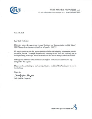 This Colt 1908 Vest Pocket was manufactured in 1916. According to the Colt Factory Archives no shipping records on this pistol were able to be found.