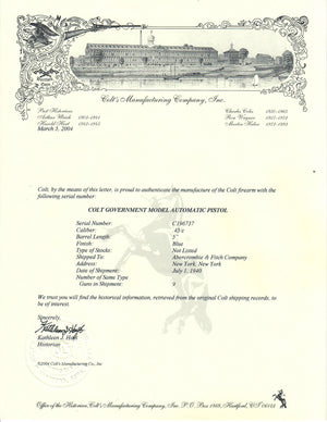 This Colt .22-45 Conversion Unit was shipped to the Abercrombie & Fitch Company in New York, New York on May 14th, 1940 in a 3 gun shipment. It notes on the factory letter that this shipped with the New Style Sights.