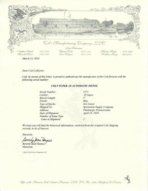 This Colt .38 Super was shipped to the Sportsman Supply Company of Pittsburgh, Pennsylvania on April 23rd 1929 in a single gun shipment.