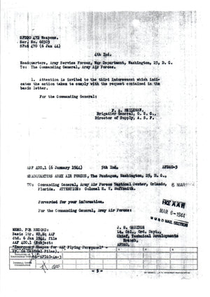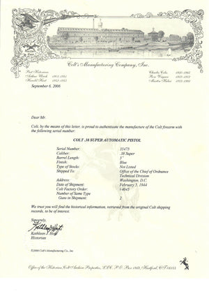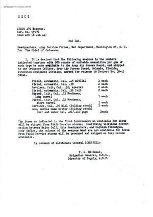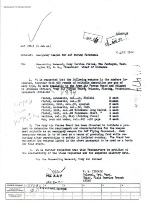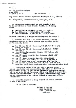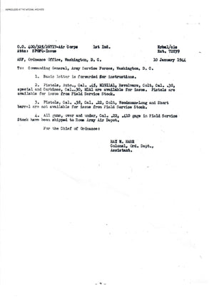 On 6 January 1944 the Field Services Branch of the Army Air Forces Ordnance Department wrote to the Commanding General of the Army Service Forces requesting a number of small arms be supplied for evaluation by a board of officers convened to consider the best emergency weapon for Army Air Forces, AAF, flying personnel. This letter and its resulting documentation, a copy of which is enclosed, requested weapons ranging from .22 automatics to Ml carbines with folding stocks, but also included two each "Pistol, automatic, cal. .38," otherwise known as the Colt Super. While some of the weapons requested were stock items and were readily supplied, others were not, most notably the .22 Colt and .38 automatic pistols. At the request of the AAF, the Army Ordnance Department procured the non-standard issue arms and so notified the AAF in the enclosed 3rd endorsement dated 8 February 1944, which also stated the serial numbers of the arms provided.
