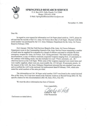 The documents from Springfield Research reads "In regard to your request for information on Colt Super pistol serial no. 35475, please be advised that the records of the U.S. Army Air Forces show that a Colt Super .38 pistol with this serial number was purchased by the U.S. Army Ordnance Department for the Army Air Forces Board in February 1944.