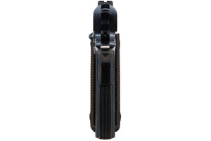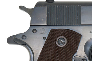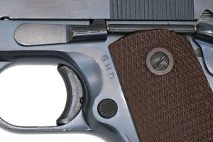 Unlike their commercial counterparts, these pistols had a few specific manufacturing requests. Note the Coltwood plastic stocks, grooved mainspring housing, grooved slide stop and stamped trigger.