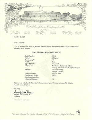 This Colt Super .38 is one of the very rare 400 Super 38's that were under a U.S. Government Contract. As seen in the factory letter this pistol was shipped to the OSS Fowler Building in Rosslyn, VA.