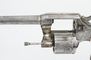 The letter states the barrel length of 6" and chambered in .38/c. Finish is labeled "Silver with gold plated cylinder, hammer and trigger". Type of stock "Pearl with carved eagle motif.". Factory Engraved: "Yes, including "Antonio Ponce de Leon Jr. etc.".