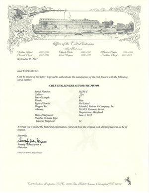 This Colt Challenger was shipped to Schindel, Rohrer & Company, Inc. at 28-30 S. Potomac Street in Hagerstown, Maryland on June 3rd, 1952 in a 12 gun shipment.