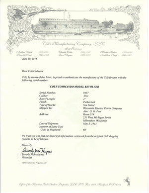 This Colt Commando was shipped to the Wisconsin Electric Power Company ATTN: G.G. Post / Room 314, 231 West Michigan Street, Milwaukee, Wisconsin on May 3rd, 1943 in a 60 gun shipment.