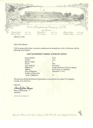 This Colt Government Model C341 was shipped to the Pacific Hardware & Steel Company in San Francisco, California on September 3rd, 1912. It was part of an 11 gun shipment.