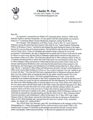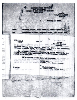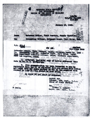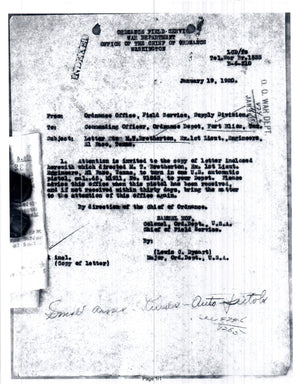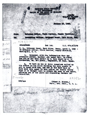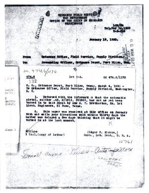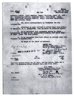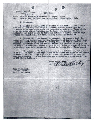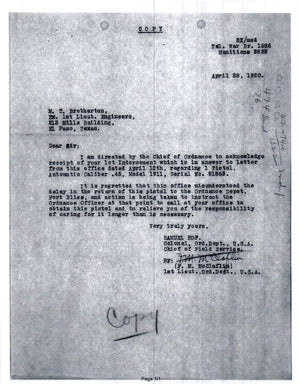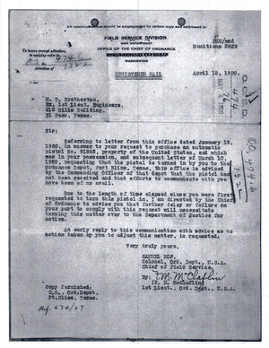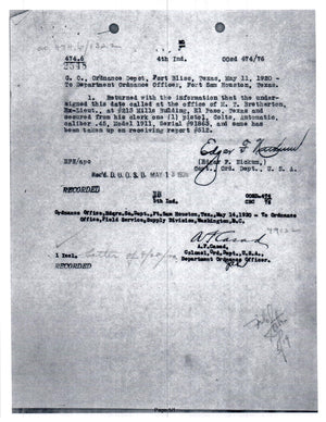 An apologetic Chief of Ordnance replied on 28 April that he regretted the misunderstanding and that the chief of the Ft. Bliss Ordnance Depot would be directed to call at Bretherton's office for the pistol. On 11 May 1920, Capt. Edgar Nickum of the Ft. Bliss Depot, advised the Chief that on that day he had gone to Bretherton's office at #213 Mills Building and "secured from his clerk one (1) pistol, Colts, Automatic, caliber .45. Model 1911. Serial #91863.