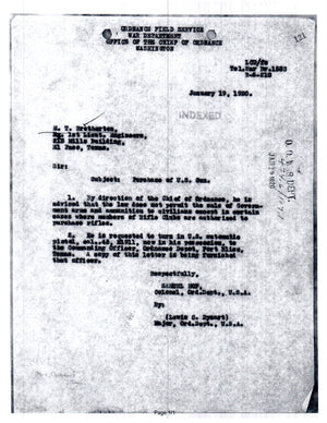 Unfortunately, the sale of standard service pistols and revolvers could only be made to officers on active duty and the Chief of Ordnance replied that he should turn the pistol in to the ordnance officer at Ft. Bliss. The Chief also advised the Ft. Bliss ordnance officer of this on 19 January and directed him to advise the Chief if the pistol was not returned in thirty days.