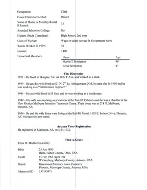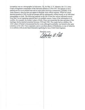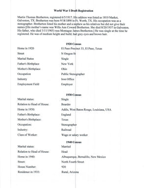 The 1920 El Paso City Directory, page 381, lists Bretherton as the manager of the El Paso Multigraphing Co., Public Stenographic Service, and he lived in a room at the YMCA. His business entry on page 477 listed him as the manager and said the firm did "circular letters, public stenography, addressing and mailing." At the time he registered for the draft his occupation was as a stenographer in Galveston, TX, for Maj. E. N. Johnston, the U.S. Army Corps of Engineers commander of the Galveston District in 1916-1917. He appears to have entered service as an enlisted man and at some point received a commission, probably in the Army Reserve, since he does not appear in Regular Army officer registers.