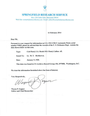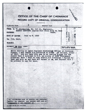 On 9 January 1920, Bretherton, in El Paso, Texas, wrote to the U.S. Army Chief of Ordnance saying this pistol had been issued to him while he was "Agent Engineer Disbursing Officer at Bordeaux, France," and that he had retained the pistol during his return to the States because he was escorting government property. He had failed to take the pistol with him when he went to Camp Travis, Texas, for discharge and wanted to keep it and pay its cost to the government.