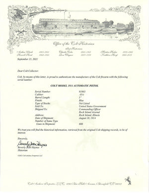 This Colt Model 1911 Automatic Pistol was Sold to the United States Government and shipped to the Commanding Officer at Rock Island Arsenal in Rock Island, Illinois on August 18th, 1914 in a 600 gun shipment.