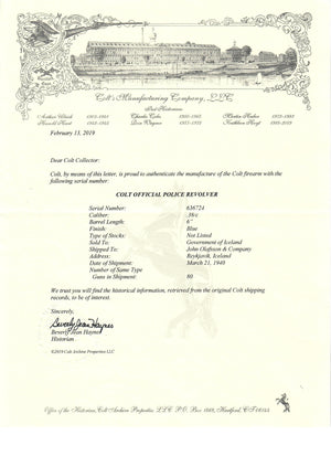 This Colt Official Police was sold to the Government of Iceland and shipped to the John Olafsson & Company in Reykjavik, Iceland on March 21st, 1940 in an 80 gun shipment. This Colt is accompanied by a box from the same shipment of pistols, the 2nd letter is for the box with serial number 636724 which is also in the same shipment.