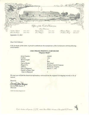 This Colt Police Positive .32 Revolver was shipped to Watkins-Cottrell Company in Richmond, Virginia on March 17th, 1941 in a single gun shipment. Accompanied by this Colt is the original box along with a invoice from Harris-Flippen & Co. Stamped April 6th. The amount was $29.94.